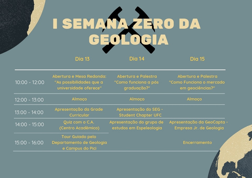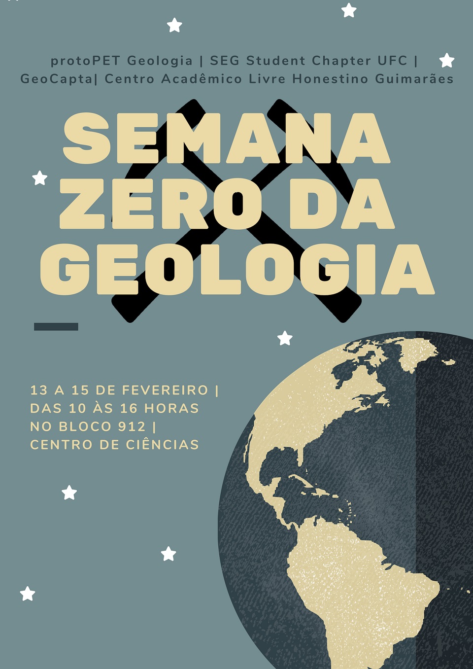 O proto-PET, a SEG Student Chapter UFC, a Geocapta e o Centro Acadêmico da Geologia convidam todos os alunos para participarem da Semana Zero da Geologia UFC.